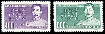 全套2枚,画面相同,均为鲁迅半身画像及诗句:“横眉冷对千夫指,食道甘为孺子牛。”这两句话,源自1932年10月12日鲁迅写给著名爱国人士柳亚子先生的一首小诗,题为《自嘲》,全文:“运交华盖欲何求,未敢翻身已碰头。破帽遮颜过闹市,漏船载酒泛中流。横眉冷对千夫指,俯首甘为孺子牛。躲进小楼成一统,管他冬夏与春秋。”这首诗写在中国最为黑暗的年代,面对外部日本帝国主义的疯狂侵略和内部国民党反动派残酷压迫及文化“围剿”,鲁迅以幽然的笔调和自嘲的口吻,描述了自己深受迫害的险恶处境,抒发了顽强的斗志和乐观的豪情。这套邮票亦于1955年1月10日再版。